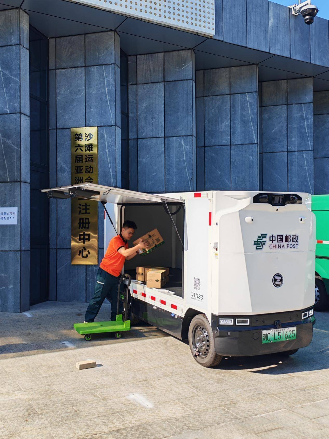 海南邮政采纳无东说念主车盘驳输送身份注册卡邮件。高娴摄